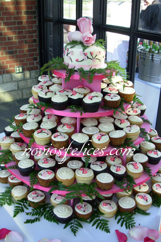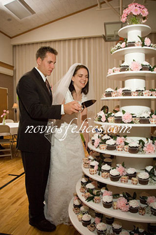 La última novedad en pasteles de boda, que causa furor en las bodas anglosajonas, son las tartas de boda echas a base de " cupcakes " o mini pasteles, tienen la ventaja de que no hay que cortarlas y además te permiten la posibilidad de ofrecer pastelitos variados para que tus invitados tengan una amplia gama de sabores y texturas dónde elegir, también está la opción de hacer una tarta para la mesa presidencial y mini pasteles idénticos para el resto de invitados. Estas originales tartas a base de pastelitos se montan sobre unos display especialmente adornados para la ocasión, quedan preciosos y son mucho mas cómodos a la hora de servirlos, puedes personalizar el montaje y combinar los colores de tu ramo de novia con los pasteles, o decorarlos con los motivos que mas te gusten, flores, corazones, mariposas, estrellas de mar, vuestras iniciales, lo que tu elijas.